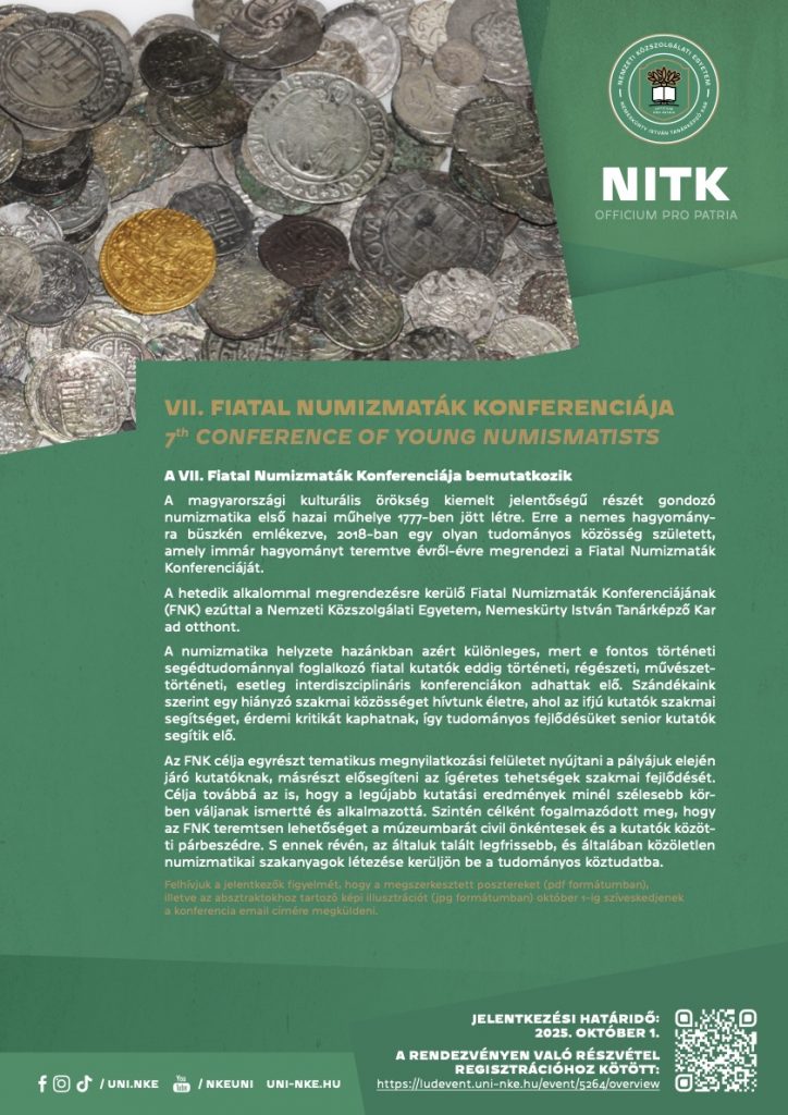 A hetedik alkalommal megrendezésre kerülő Fiatal Numizmaták Konferenciájának (FNK) ezúttal a Nemzeti Közszolgálati Egyetem, Nemeskürty István Tanárképző Kar ad otthont.